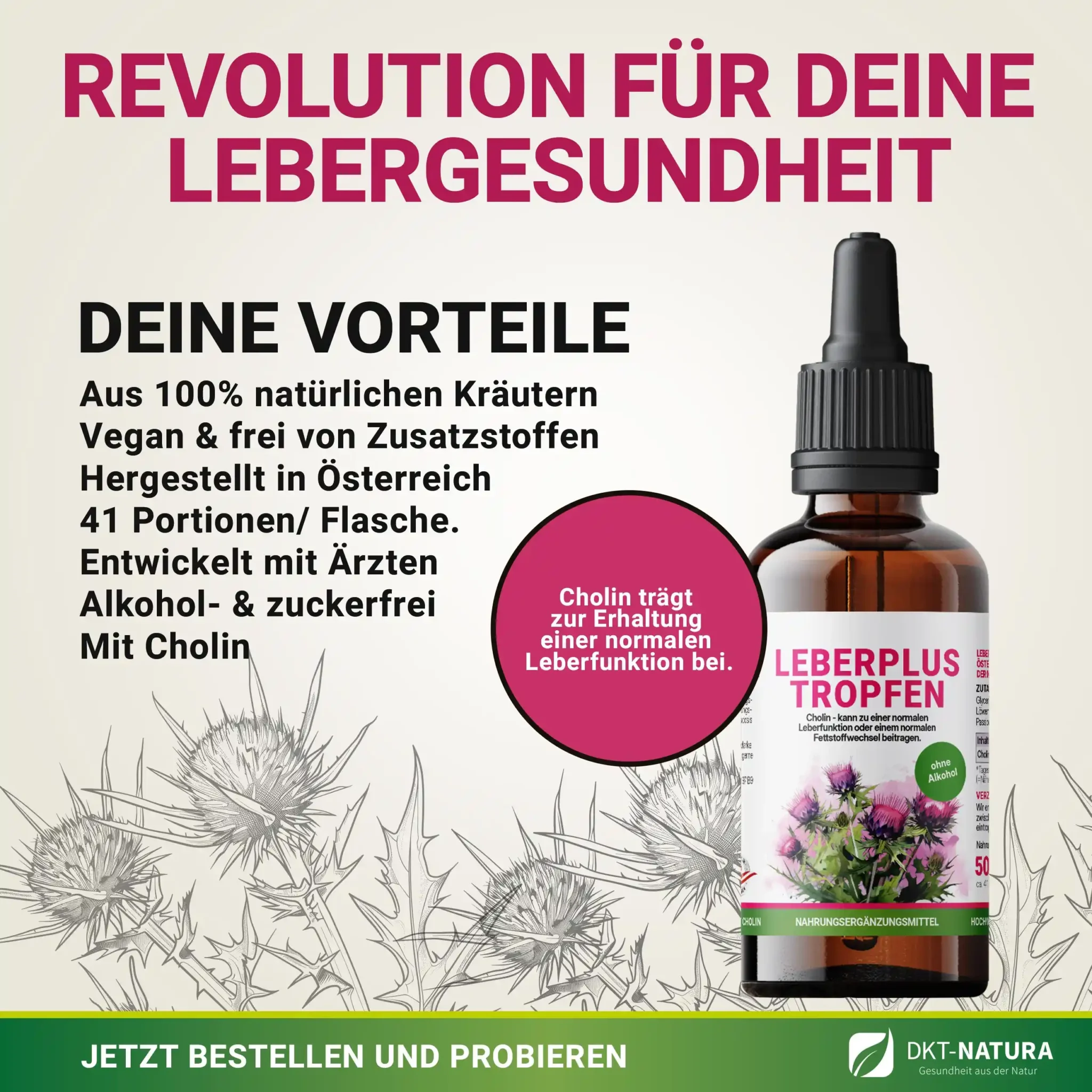 Hier setzt DKT-NATURA an: Unsere Leberplus Tropfen liefern nicht nur das lebenswichtige Cholin in optimaler Dosierung, sondern kombinieren es mit traditionellen Kräutern, die seit Jahrhunderten die Lebergesundheit unterstützen. Entwickelt mit österreichischen Ärzten, frei von schädlichen Zusätzen und bereits von über 5.000 Menschen erfolgreich getestet.